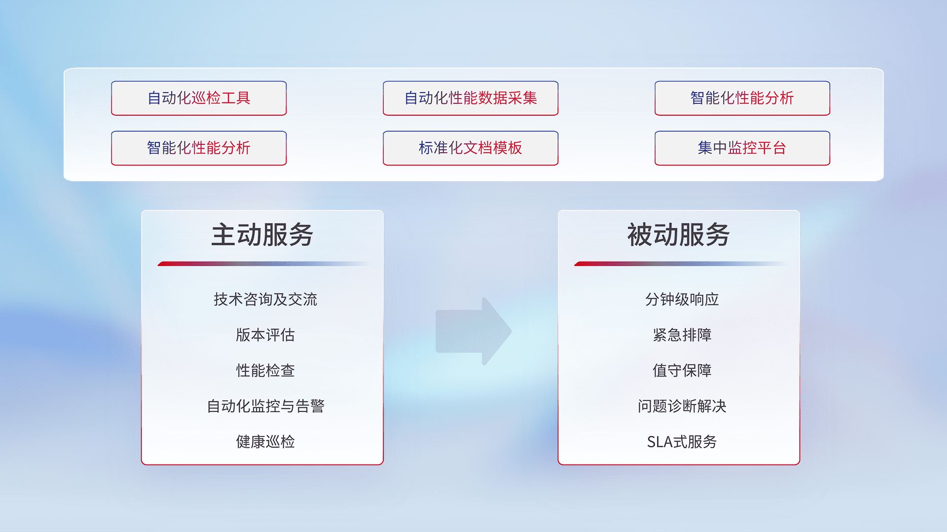 智能化工具和标准化文档,,保障服务质量,,提供主动服务(包含技术咨询、、版本评估、、性能检查、、、、自动化监控与告警、、、、健康巡检)和被动服务包含(分钟级响应、、、紧急排障、、、、值守保障、、问题诊断解决、、、SLA服务)。。
